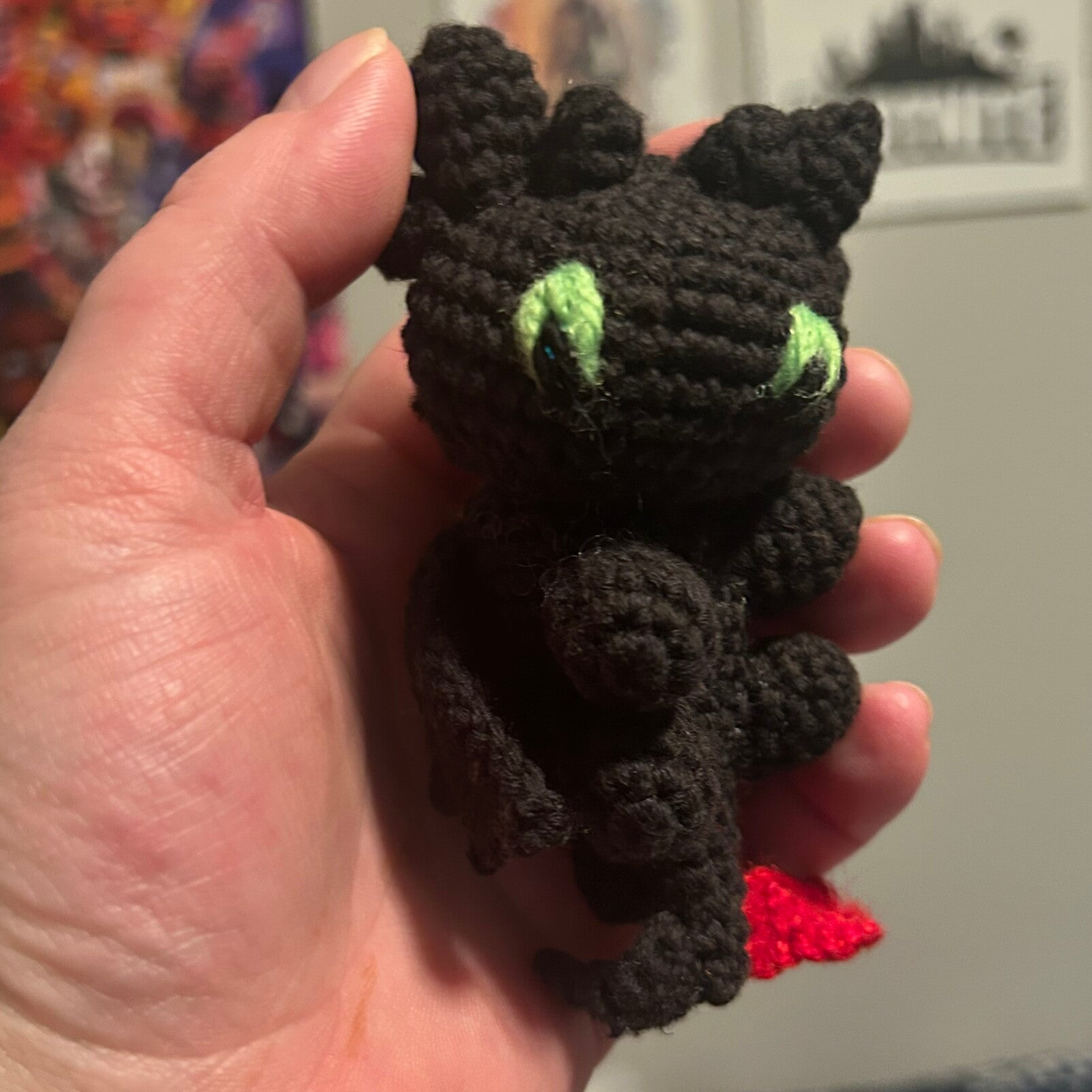 We've just come off of Easter break here which meant the kids returned to school. A friend of my biggest kid handed him $20 a few weeks back and asked if he could commission me to make a toothless keychain. Oh boy! All I could think was black yarn...IYKYK! Well over the break I had a bit of time to play catch up so I set out on the task of making a toothless. I thought "how nice would it be for him to go back to school with a special little gift for this friend!" I did it! A small little handheld toothless! My son hooked him on his backpack and away he went. Well shock came to me when at the end of the day my son came home followed by his friend, he took a detour on his drive home so that he could stop in and thank me personally!